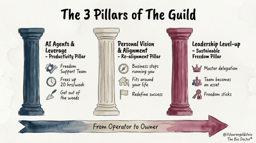 The Guild is a highly curated, 90-day accelerator designed with two goals in mind: to create capacity (hello at least 20 hours back per week) in your business and shift how your business operates going forward so it works more for you.